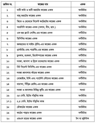 বিভিন্ন কাজের একক নির্মাণ কাজের এককসমূহ: